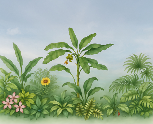 Delikatna, akwarelowa ilustracja przedstawiająca tropikalny ogród z bananowcem i bujną roślinnością. Subtelne przejścia kolorów i miękka faktura farby tworzą harmonijną, relaksującą tapetę ścienną, idealną do wnętrz w stylu naturalnym i boho.