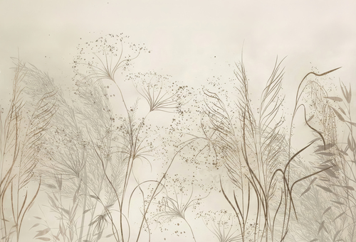 Tapeta przedstawia subtelny, botaniczny szkic polnych traw i roślin baldaszkowatych, utrzymany w ciepłych, naturalnych odcieniach beżu i sepii.