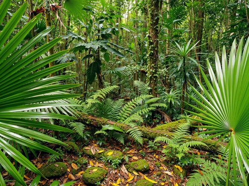 Fotografia przedstawia wnętrze bujnego lasu tropikalnego oświetlonego miękkim, rozproszonym światłem dziennym, które równomiernie wydobywa detale bez tworzenia ostrych promieni czy cieni. Dwa wielkie liście palmy wachlarzowatej tworzą naturalną ramę dla gęstej, soczyście zielonej roślinności i omszałego dna dżungli.